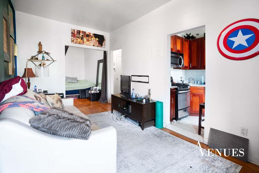 Newly renovated with hardwood floors throughout, marble bathroom, high ceiling, separate kitchen and a lot of natural light.