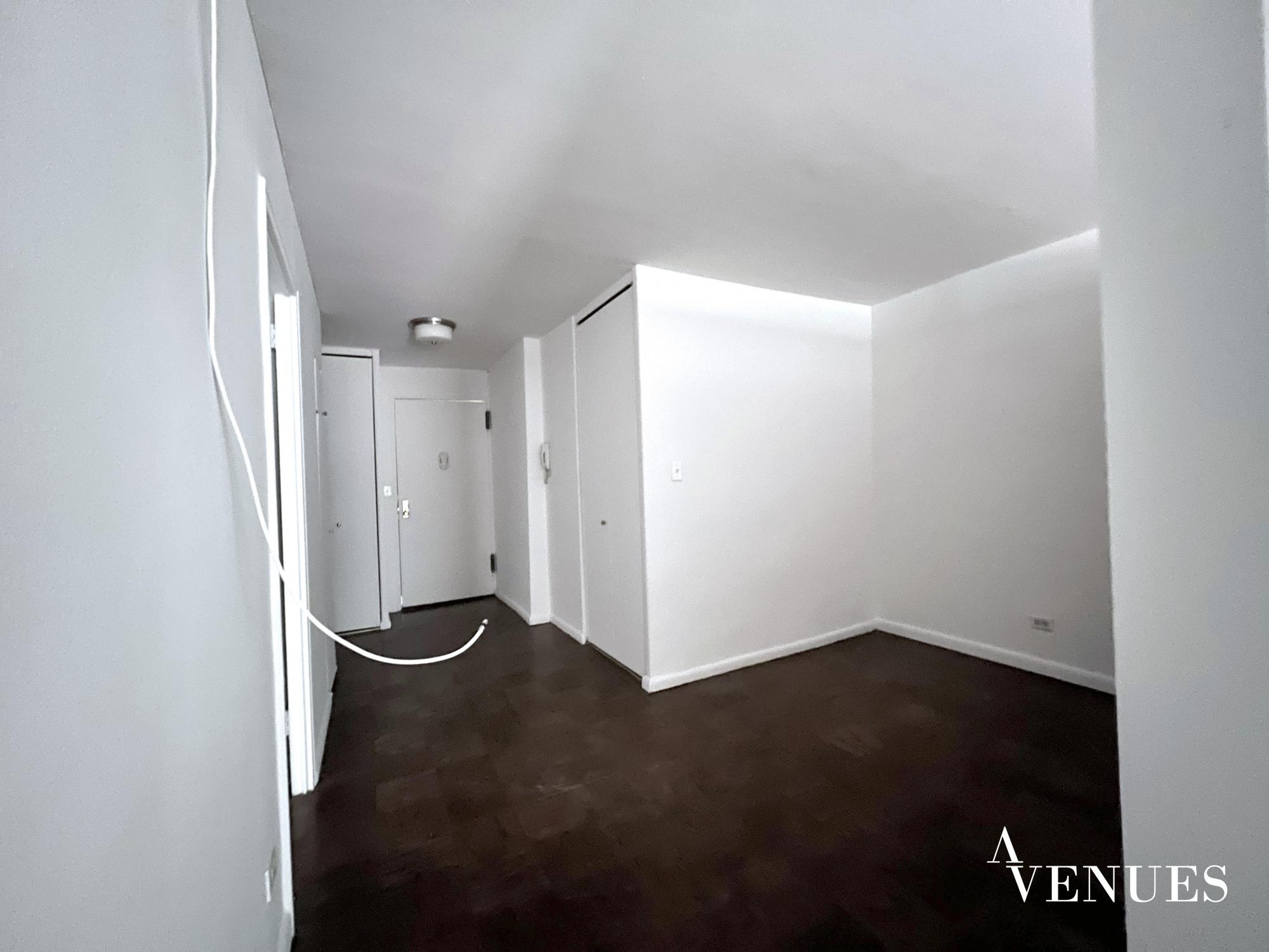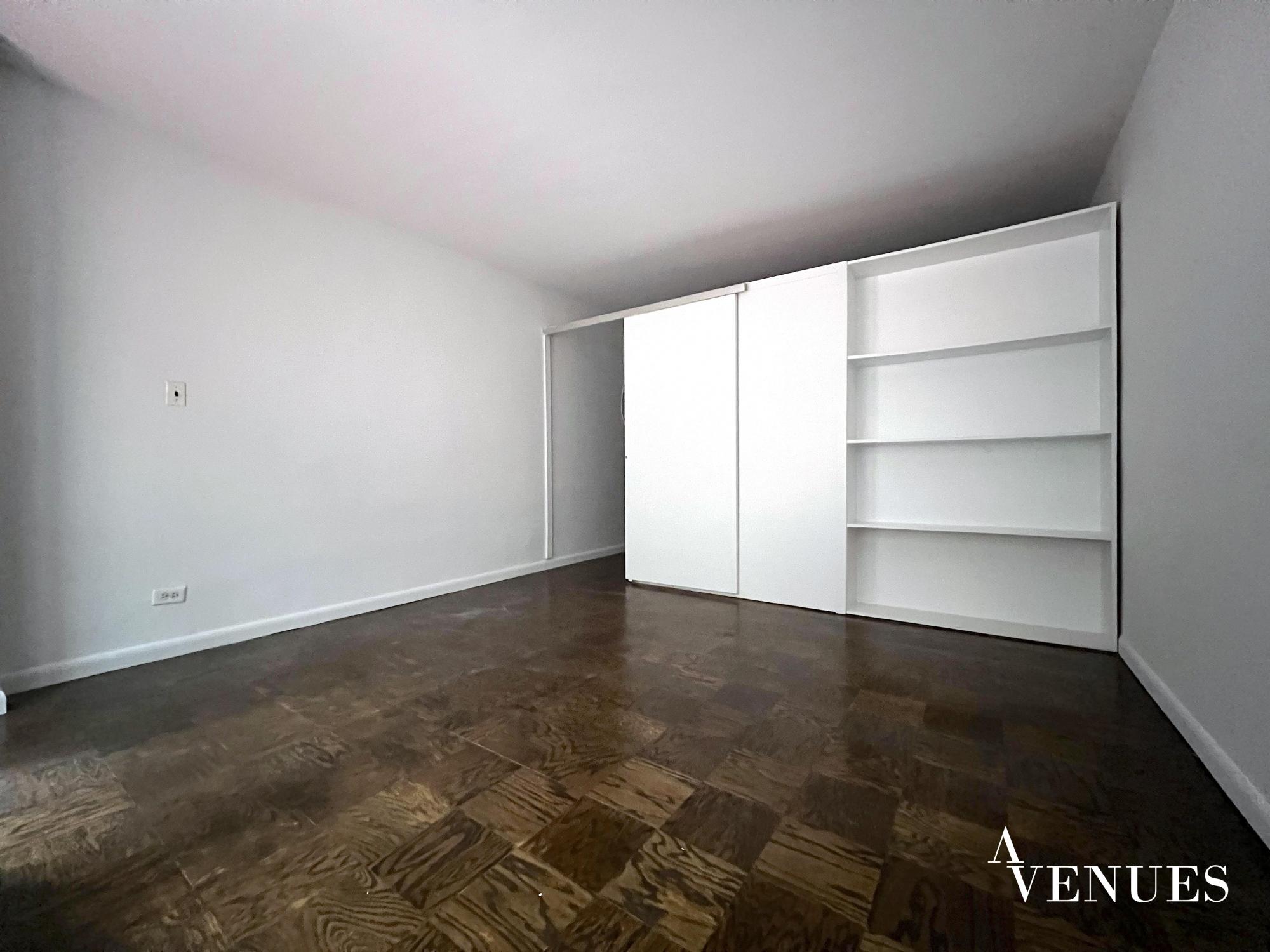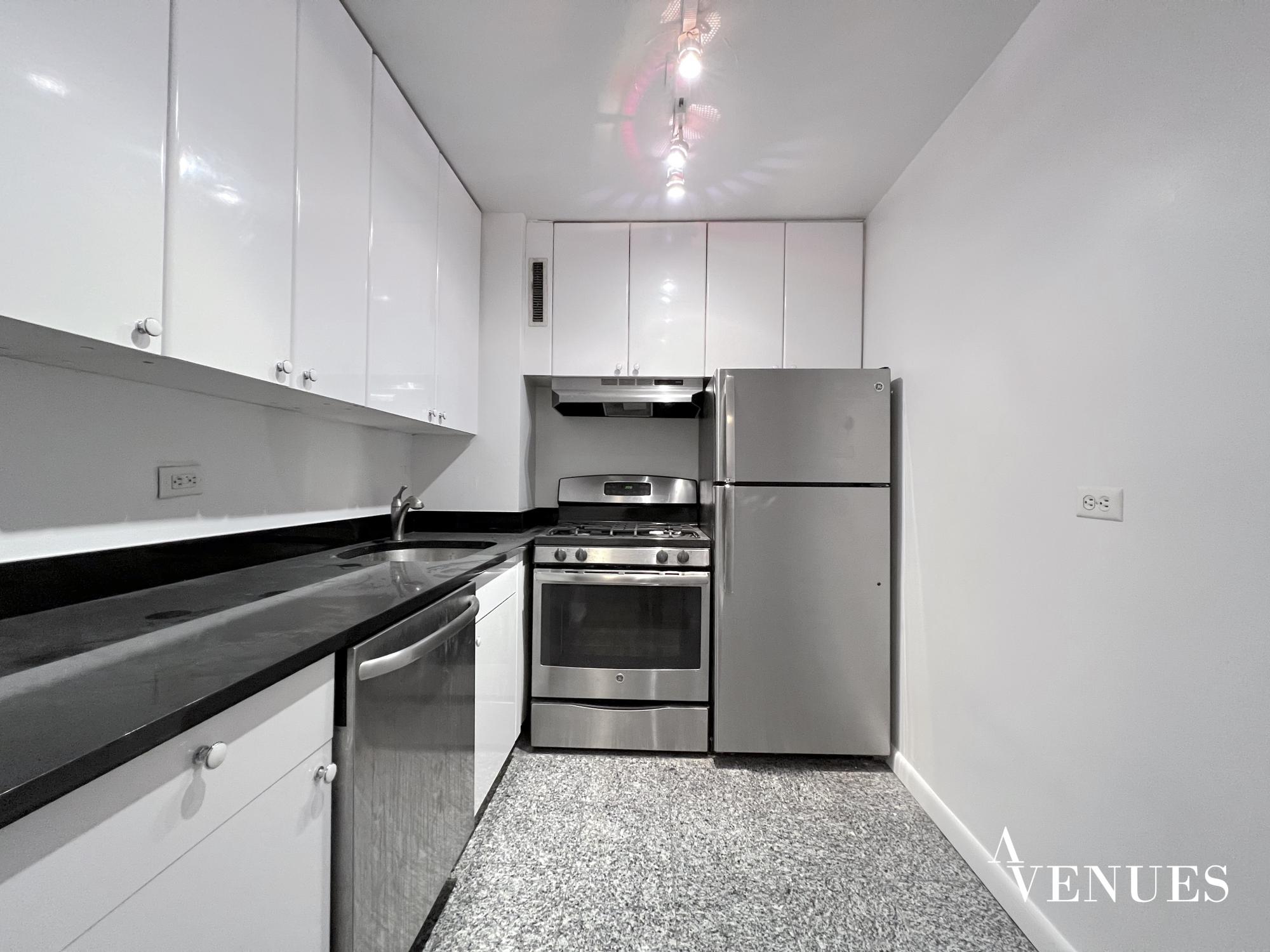 Kitchen – white formica cabinets, black granite countertops, stainless steel appliances.