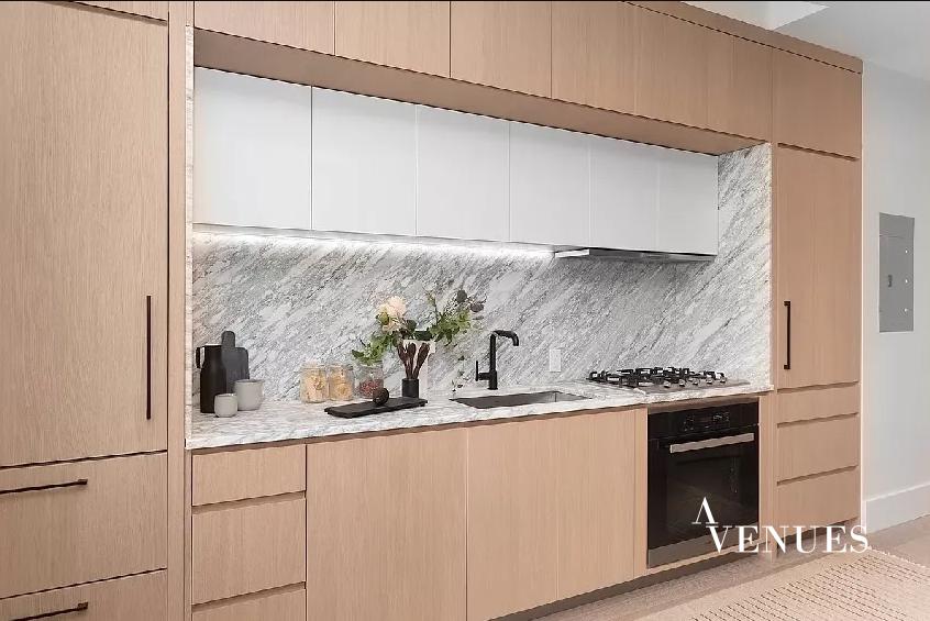Kitchen w/ Arabescato Bluette marble countertops & backsplash