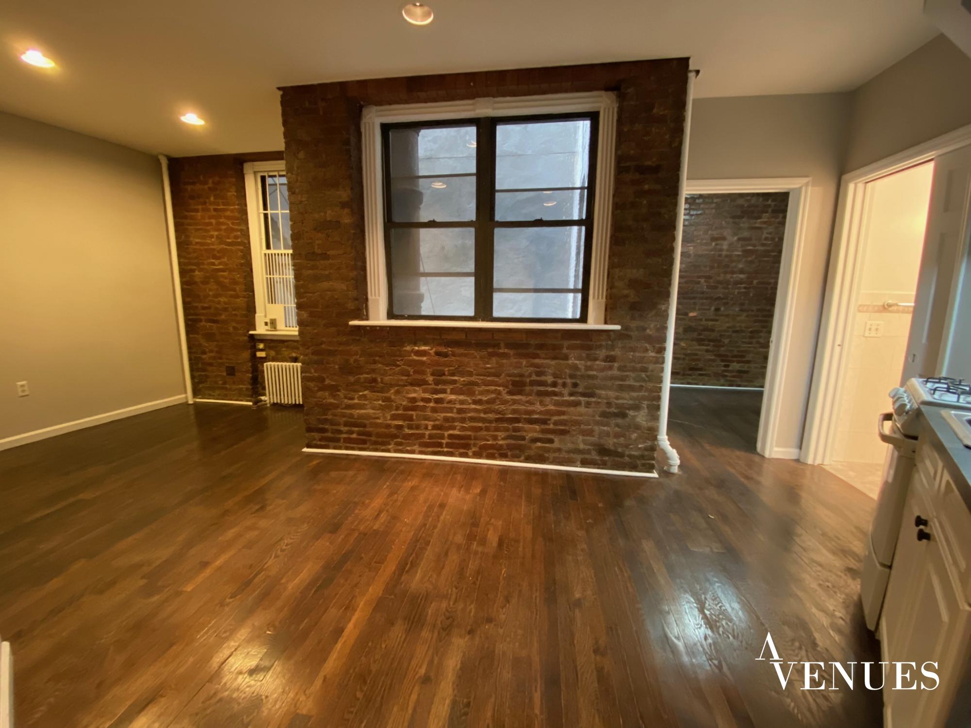 Beautifully renovated 1 bedroom apartment with garden. Features a granite kitchen with stainless steel appliances including a dishwasher, exposed brick, and hardwood floors.