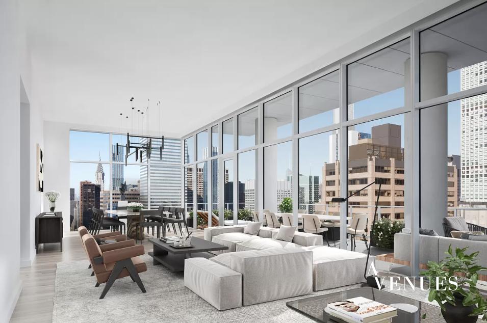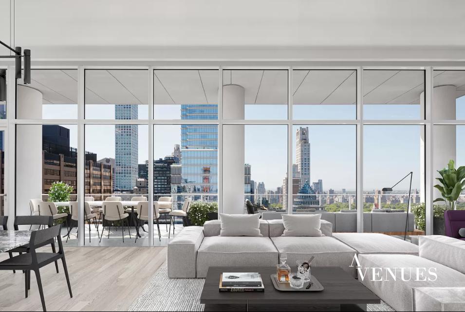 Introducing Penthouse 34, an unparalleled, three-bedroom, three and a half bath full floor residence with 14’ finished ceilings, and 148 linear feet of continuous terrace with 360 degree views of Central Park and the Manhattan skyline. The floor to ceiling glass windows and expansive 14 ceilings tie the inside/out living concept together perfectly. The 3,471 square foot terrace seamlessly connects the corner great room to a kitchen outfitted with Italian white glass and aluminum trim cabinetry by Aran Cuchine, book matched honed Calacatta marble slab countertops, a natural white oak island and full-height backsplashes, and integrated Brilliant White glass appliances by Miele including an integrated wine refrigerator. The expansive northern facing master bedroom features two separate dressing rooms and a luxurious en-suite master bath clad with Siberian white polished marble walls and honed marble floors with radiant heating. A floating vanity is crafted from Siberian mink polished marble, fixtures by Watermarks contemporary Loft 24 Collection in a polished chrome finish, and a spa-like floor-to-ceiling glass enclosed rain shower with thermostatic controls along with a freestanding deep-soaking bathtub. Wall-mounted toilets are by Toto. A washer and dryer is tucked away in the tranquil powder room with custom-designed pedestal sink, Cremo Delicato honed marble slab floor with a Ceruse finished white oak feature wall which completes this elegant residence.