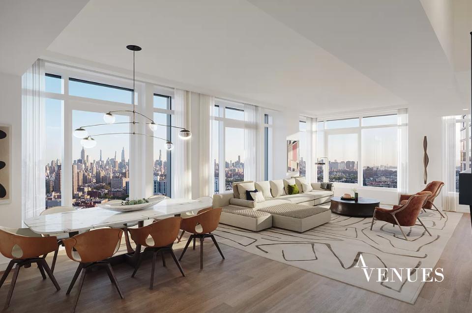 This incredible Penthouse features a corner Great Room with western sunset views over Downtown Manhattan as well as panoramic city views north to the Empire State Building. An architectural staircase from the Great Room leads to a private 733 SF wraparound roof terrace that features a gas grill. With ceilings of approximately 10’, this CetraRuddy-designed home features wide plank European Oak flooring, a highly customized open kitchen with One Essex Crossing’s noteworthy signature mesh storage cabinet incorporated into the backsplash, imported Italian cabinetry, and honed Dolomiti marble on the countertops and waterfall. A suite of professional Miele appliances includes a fully vented hood.