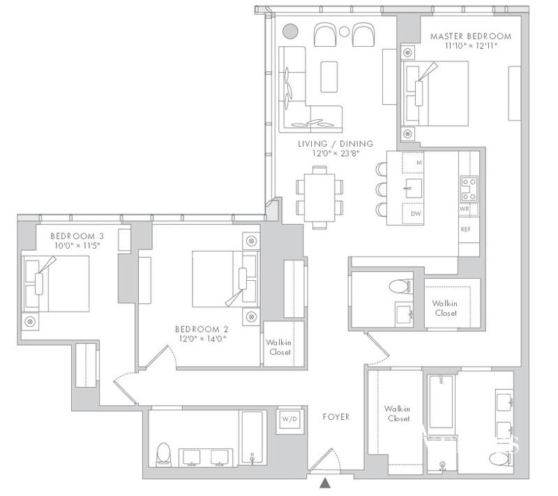 The entry foyer leads to the living and dining room with an open kitchen including a waterfall island, wine refrigerator, fully-vented range hood, waste disposal, and an appliance package designed by Bosch. The residence features a vented washer/dryer, and a five-fixture bathroom in the master suite, making it a truly unique and elevated offering.