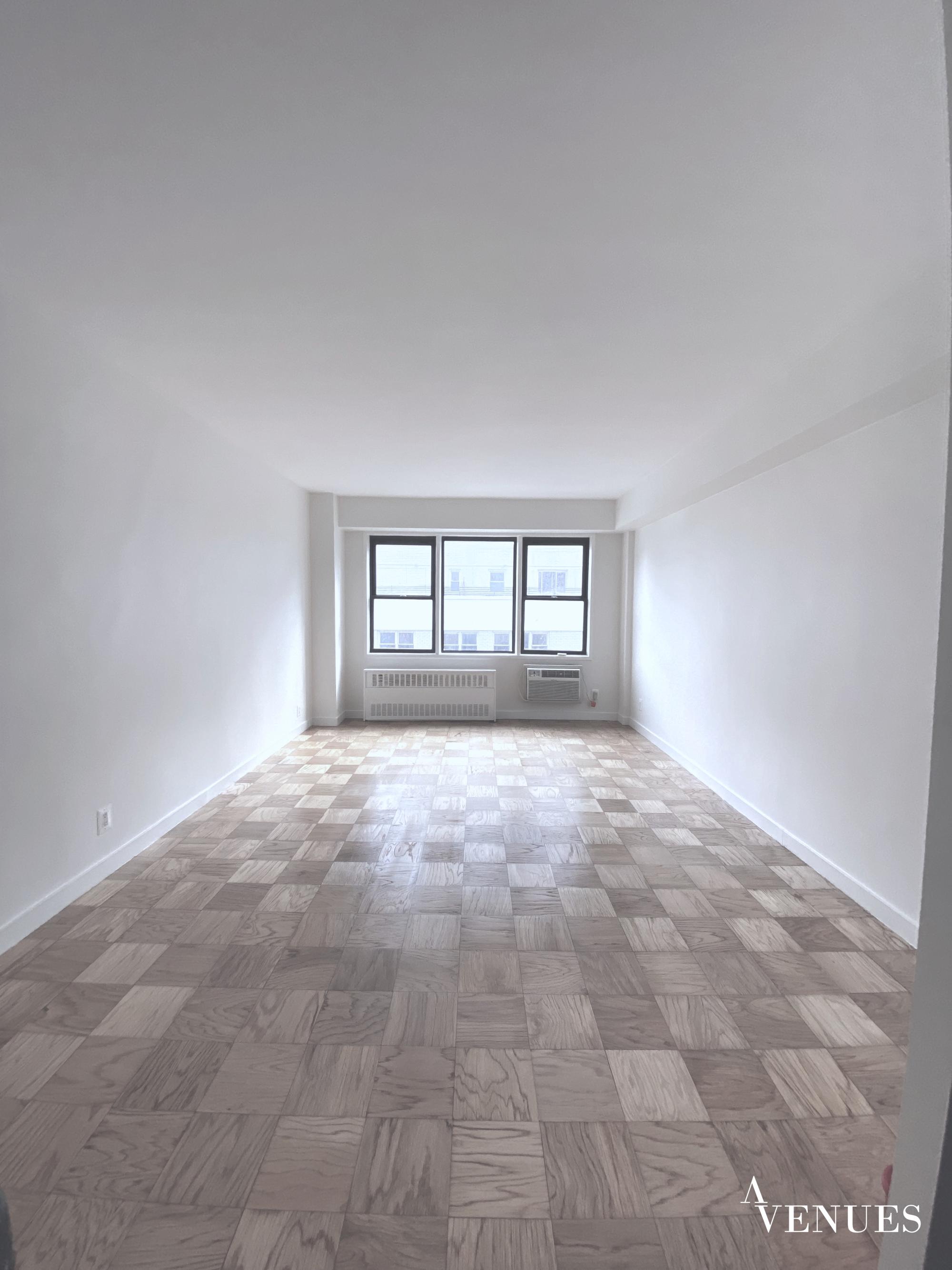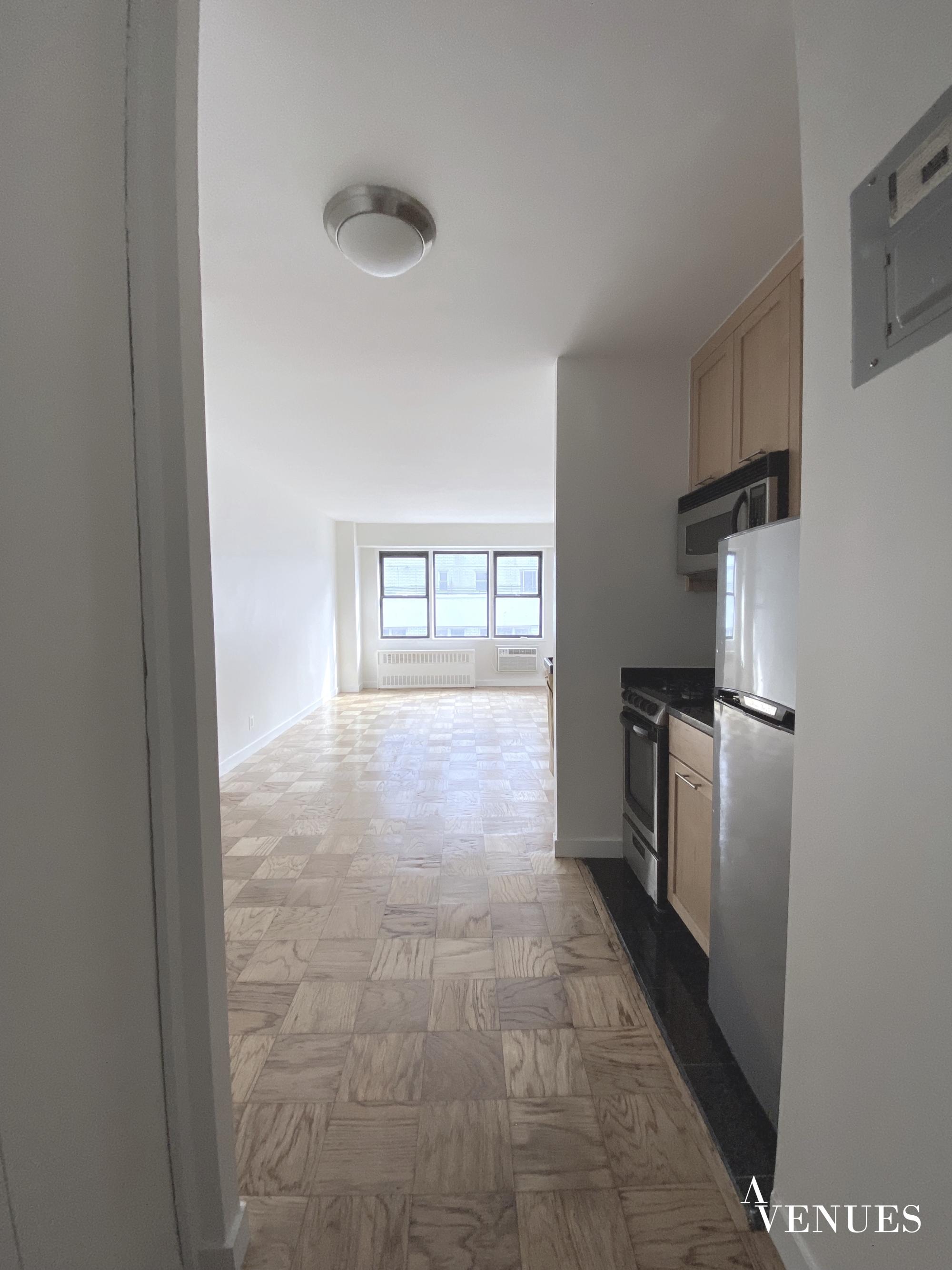 This amazing & sunny studio offering a large living area space , kitchen, closets, high ceilings , hardwood floor and a marble bathroom.