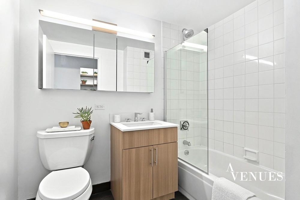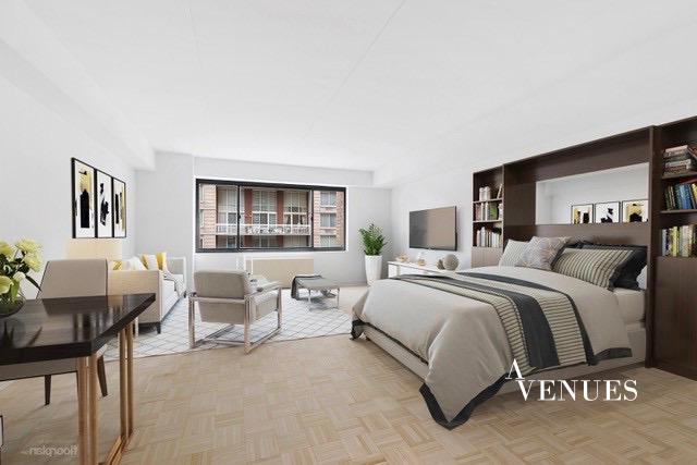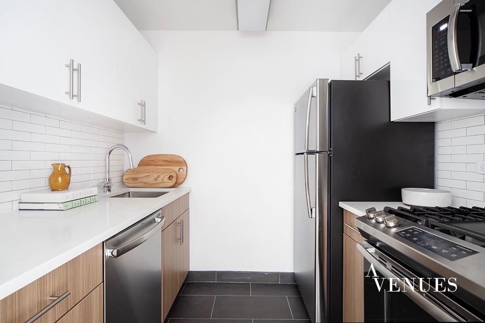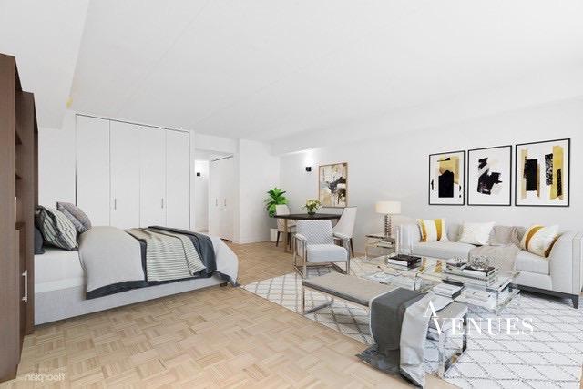 This studio apartment has undergone a complete renovation and has unencumbered light and serene city views. A gourmet kitchen includes modern gloss paneled flat-front cabinetry with high-end stainless-steel appliances.